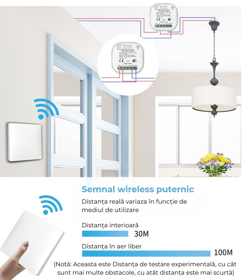Comunicarea dintre întrerupător și controllere se realizează prin semnal radio la frecvența de 433 MHz, asigurând transmisie rapidă și stabilă pe o distanță de până la 100 de metri (în spațiu deschis). Controlerele se conectează la rețeaua Wi-Fi, permițând gestionarea dispozitivelor prin aplicațiile mobile Tuya Smart sau Smart Life, de oriunde te-ai afla.